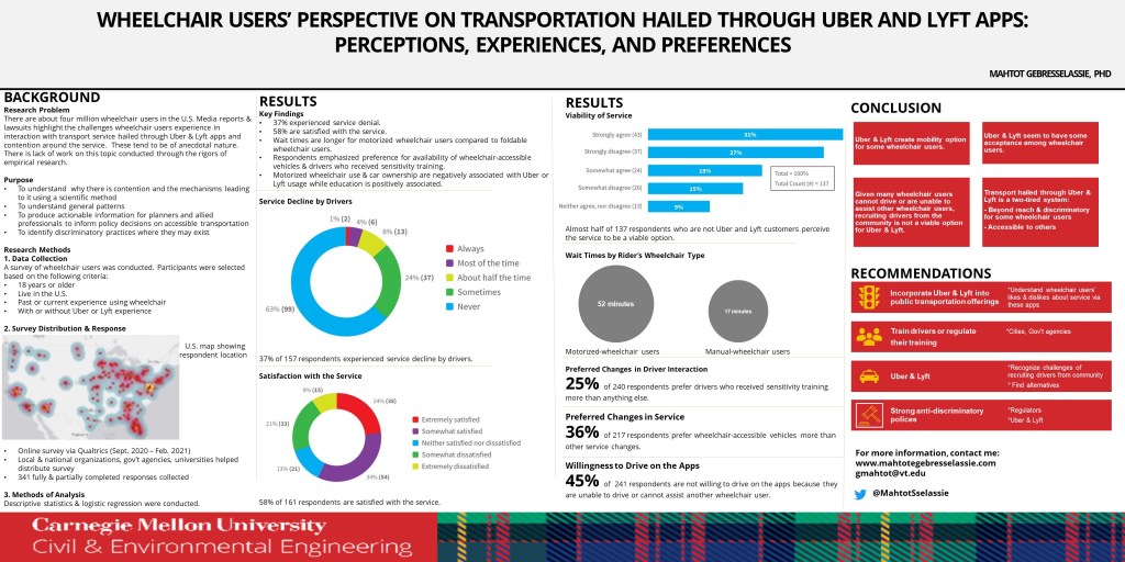 Gebresselassie, M. (2022, January). Wheelchair users’ perspective on transportation service hailed through the Uber and Lyft apps. [Poster presentation]. Transportation Research Board, Washington, DC.