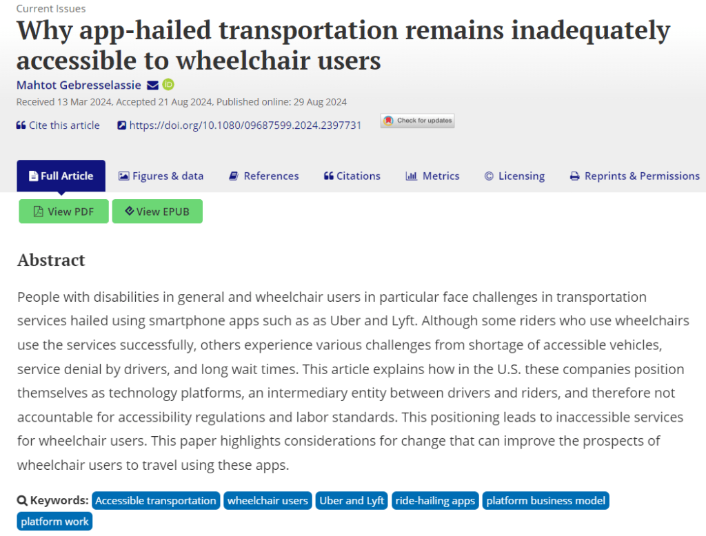 Gebresselassie, M. (2024). Why app-hailed transportation remains inadequately accessible to wheelchair users. Disability & Society. doi.org/10.1080/09687599.2024.2397731